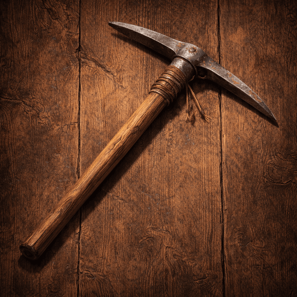 A sturdy but well-worn pickaxe used by miners, explorers, and treasure seekers. Though not built to last forever, it is perfectly suited for breaking open mineral veins and harvesting valuable resources hidden within stone. Effect: Can be used to gather from 1d2 resource nodes before the pickaxe breaks. Each successful gathering attempt counts toward its durability. Once its uses are expended, the pickaxe becomes unusable.