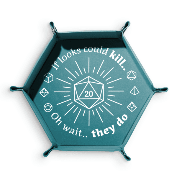 This dice tray bears the words “Looks could kill… oh wait… they do,” perfect for those whose charm is as deadly as their dice rolls. Whether you’re staring down foes or rolling for that devastating crit, this tray is ready to catch your dice with lethal precision. So let fate sing in your favor, and gaze upon your greatness.